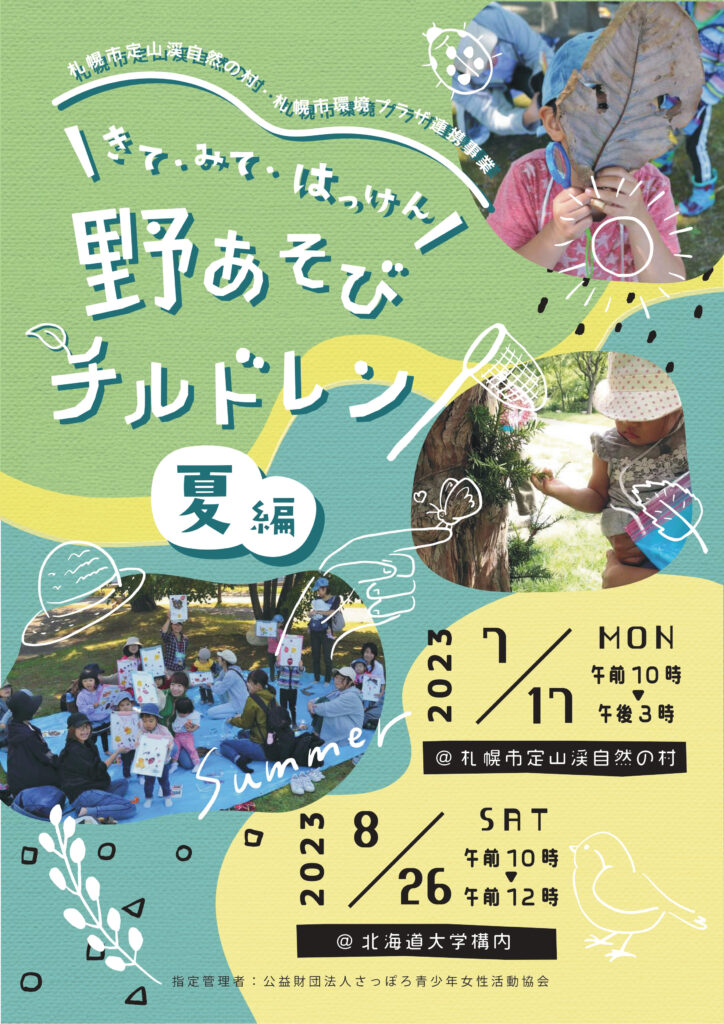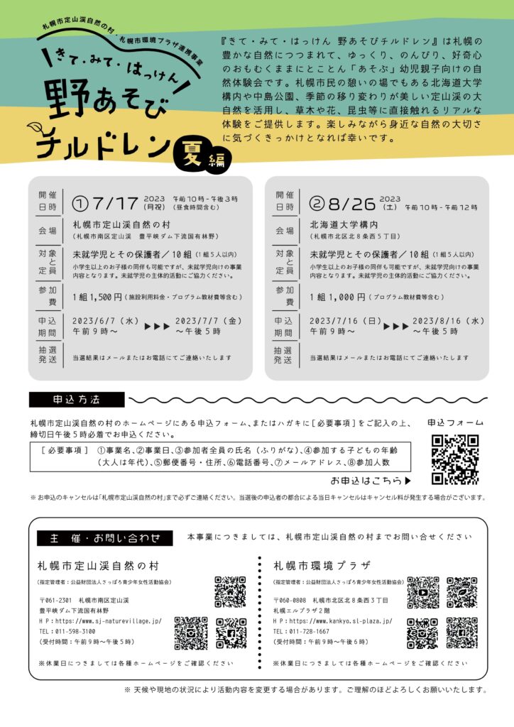 [申込方法] 定山渓自然の村HPにある申込フォーム、またはハガキ(①事業名②事業日③参加者全員の氏名(ふりがな)④参加する子どもの年齢(大人は年代)⑤郵便番号・住所⑥電話番号⑦メールアドレス⑧参加人数をご記入の上、定山渓自然の村宛にお送りください。)