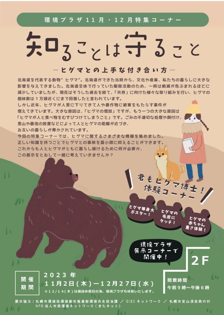 環境プラザでは2か月に一度テーマを変えて環境に関する様々な展示を行っています。11-12月のテーマは「ヒグマ」です。