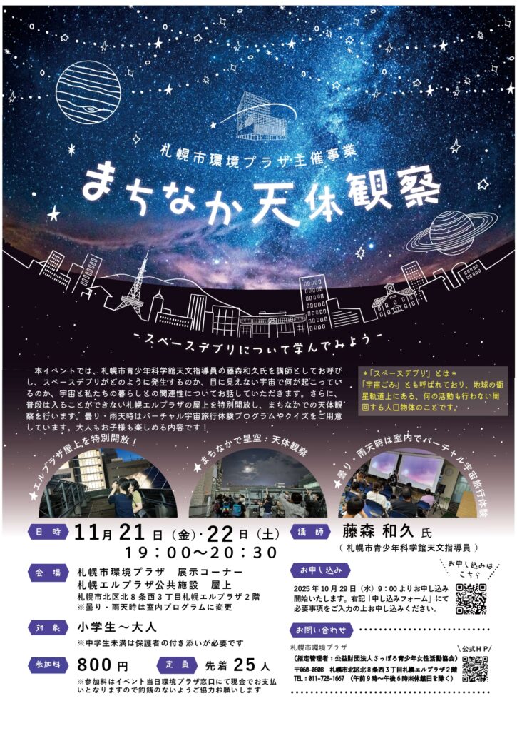日没も早まり、天候に恵まれれば長い時間空を眺めていられる季節になってきました。運がよければ土星や海王星が見られる暦になっています。少しだけ厚着をして、札幌のまちなかで空を見上げるスペシャルな体験をしてみませんか?