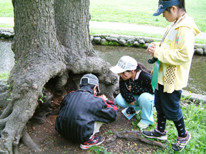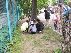 グループごとにどんな生きものを調べるのか話し合いをした後、北海道大学の構内へ生きもの調査に行った。