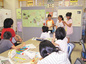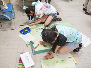見つけた生きものを図鑑で調べるなどして、グループごとに生きものマップを作成した。