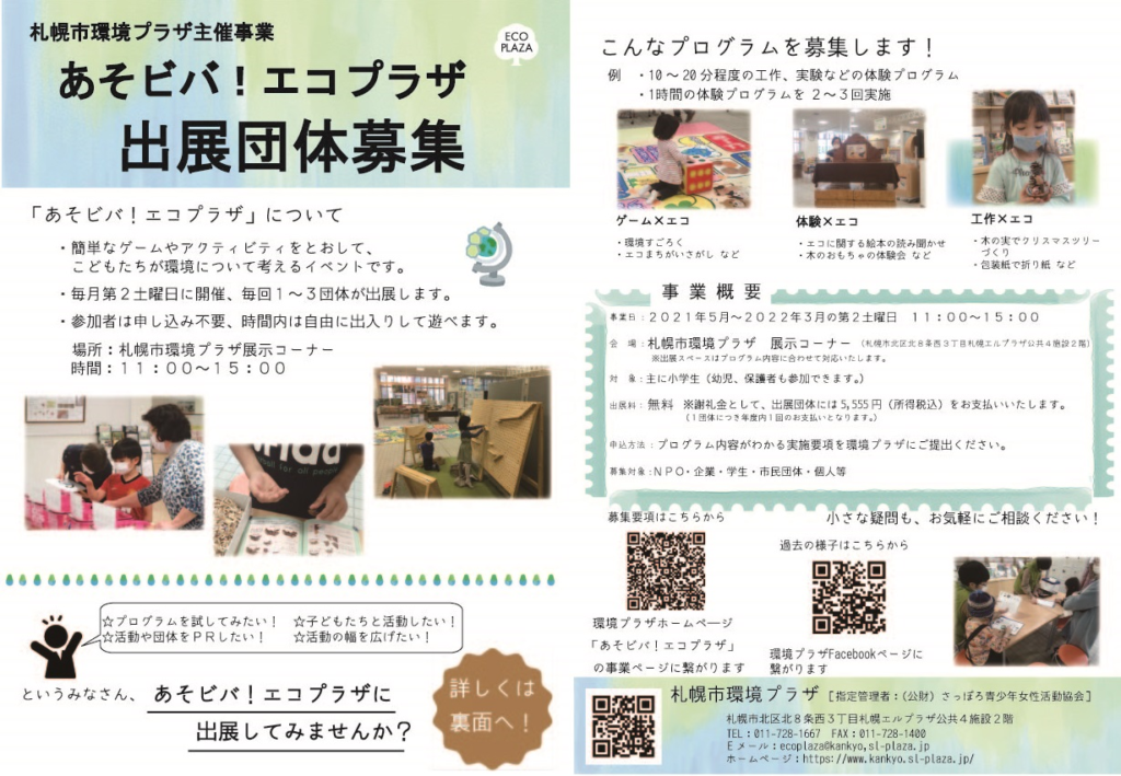 あそビバ!エコプラザ 出展団体募集中!! 2021年4月8日 「あそビバ!エコプラザ」の出展団体を募集しています。「子どもを対象にプログラムを試してみたい」「小規模イベントでプログラムの経験を積みたい」「団体や活動のPRをしたい」「活動の幅を広げたい」・・・そんなみなさん、環境プラザでチャレンジしてみませんか?出展内容などお気軽にご相談ください。 募集要項はこちらから 一覧に戻る