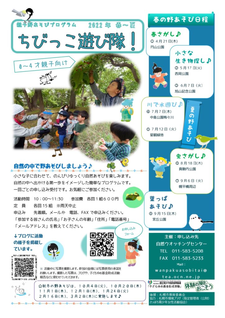 協力事業「親子野あそびプログラム『ちびっこ遊び隊!』2022 春~夏」 2022年4月17日 自然ウオッチングセンター主催事業、「親子野あそびプログラム『ちびっこ遊び隊!』2022」のお知らせです。2022年 春~夏のプログラムがまもなく開始となります。 今年も様々なプログラムが企画されていますので、皆さまぜひご参加ください。 日時や場所は各回によって異なりますので、イベントチラシや 自然ウオッチングセンター HPをご確認ください。 一覧に戻る