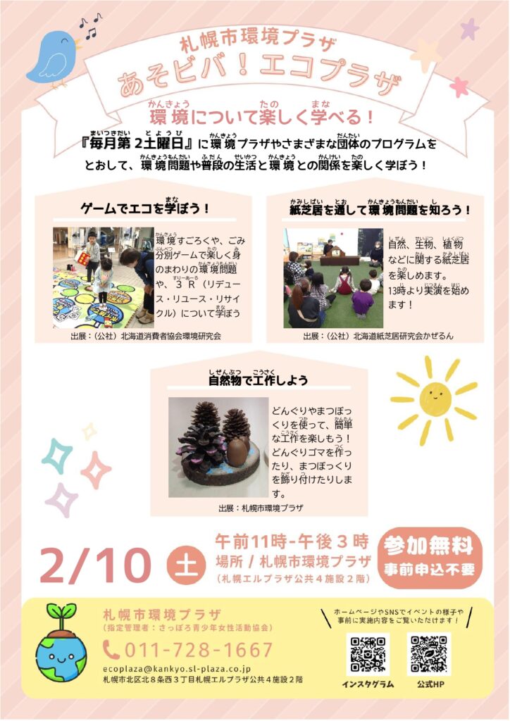 毎月第2土曜日に環境プラザやさまざまな団体のプログラムをとおして、環境問題や普段の生活と環境との関係を楽しく学ぼう!