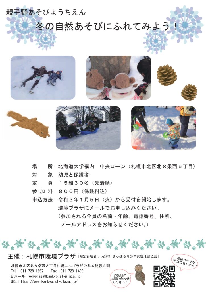 夏・秋と実施してきた親子野あそびようちえん。今回は定山渓自然の村と連携し、北大を舞台に、冬を五感いっぱいに感じながら楽しめるあそびを多数ご紹介いたします!